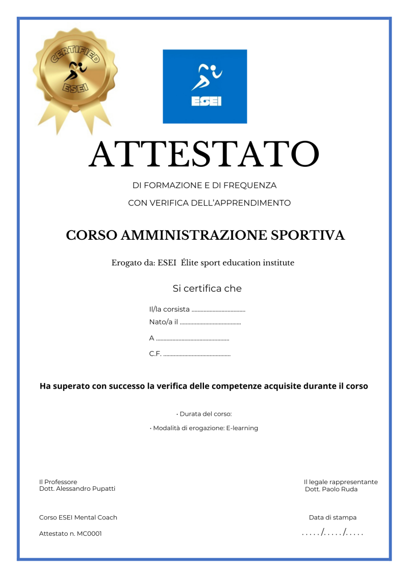 Al termine del corso, verranno rilasciate delle certificazioni che convalidano le competenze acquisite, aprendo le porte a una carriera nel mondo dell’amministrazione sportiva. Questo corso è ideale per chi vuole contribuire al successo e alla crescita delle organizzazioni sportive, giocando un ruolo chiave nella loro gestione economica e operativa.